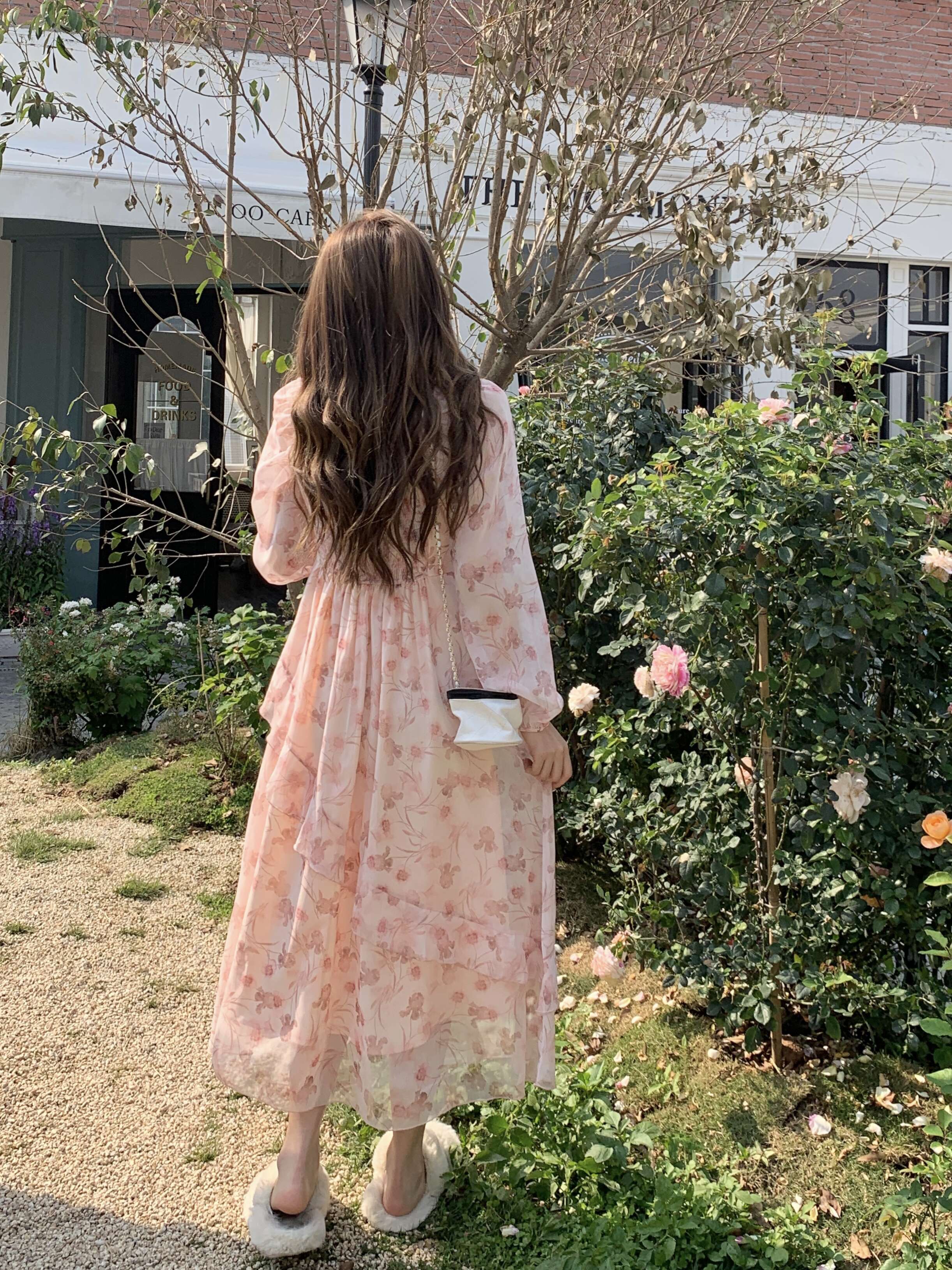 シフォンの美しい花柄長袖ワンピース。柔らかな素材がふんわりとしたシルエットを叶え、女性らしさを引き立てます。ロング丈で、足元はパンプスやローファーなどに合わせて、大人っぽくラフに。夜はヒールで、華やかなシチュエーションにも対応できます。控えめで上品な花柄が、華やかにオシャレを楽しむ大人女子にぴったりです。カラーはピンクと薄めのグリーン。