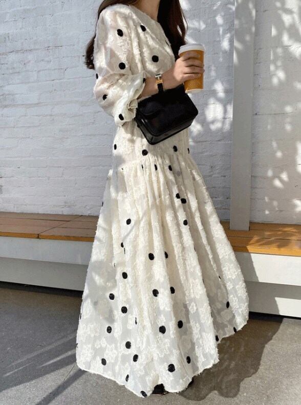 ワンピース ロングワンピース ロング丈 袖付き 長袖 ラウンドネック ウエストマーク シースルー かわいい 大人可愛い きれいめ シンプル カジュアル 大人 上品 おしゃれ かっこいい 大人女子 こなれ感 ラフ レトロ キュート ガーデン 個性的 主役級 存在感 ドット柄 水玉 春 秋 10代 20代 レディース 女性用 デート お出かけ 女子会 お泊まり 休日 リゾート 旅行 ホテル ショッピング レストラン 着回し 普段使い ファッション コーデ スタイル ワンサイズ ゆったり 楽ちん モテ