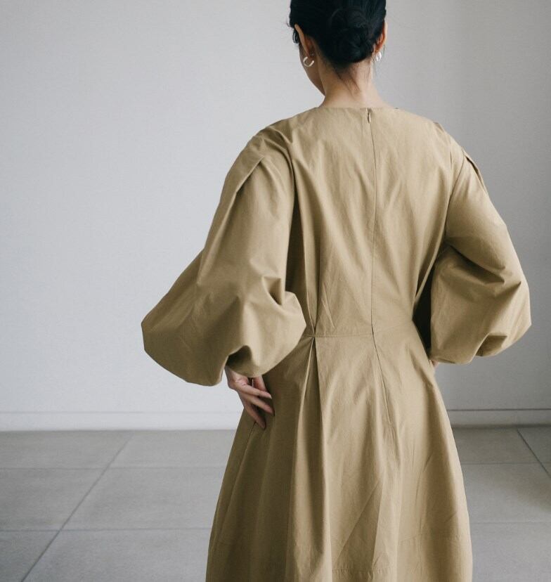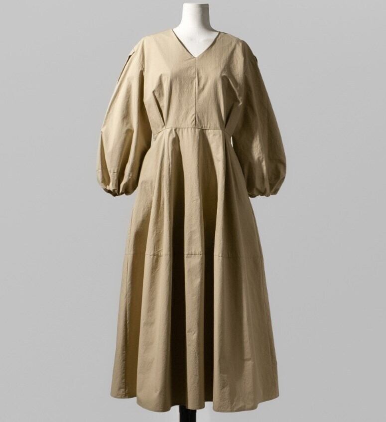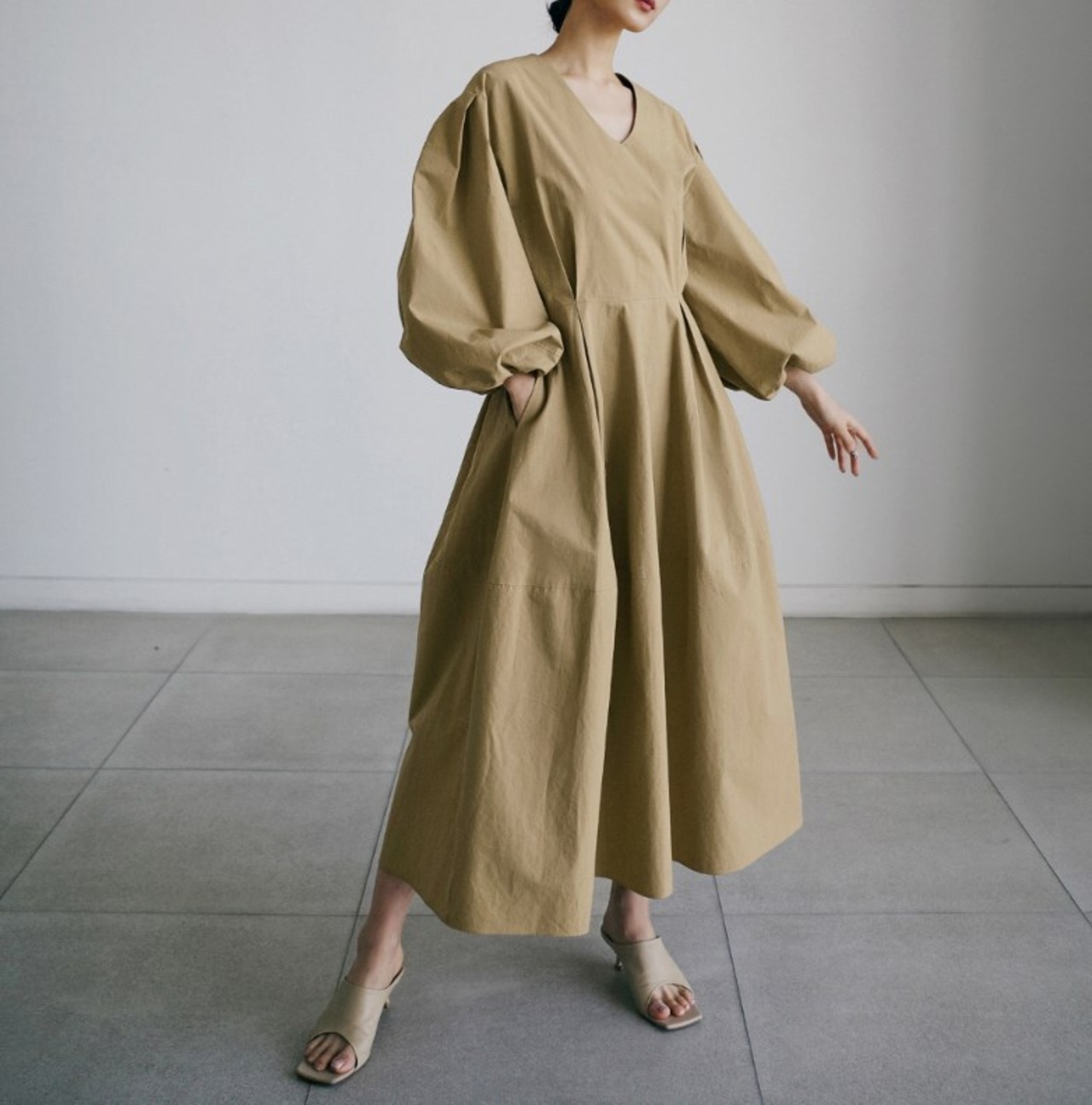 Vネックデザインに大胆なボリューム袖が目を引く、女性らしいシルエットのミモレ丈ワンピースです。