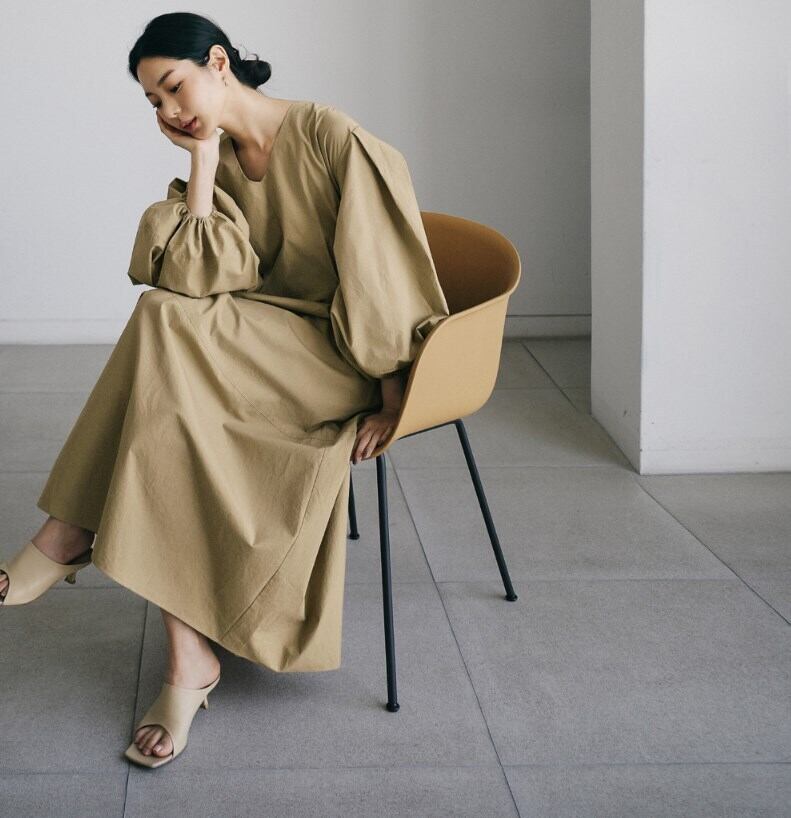 ウエストマークでメリハリをつけつつ、ワイドなフレアシルエットが体型カバーにもぴったり