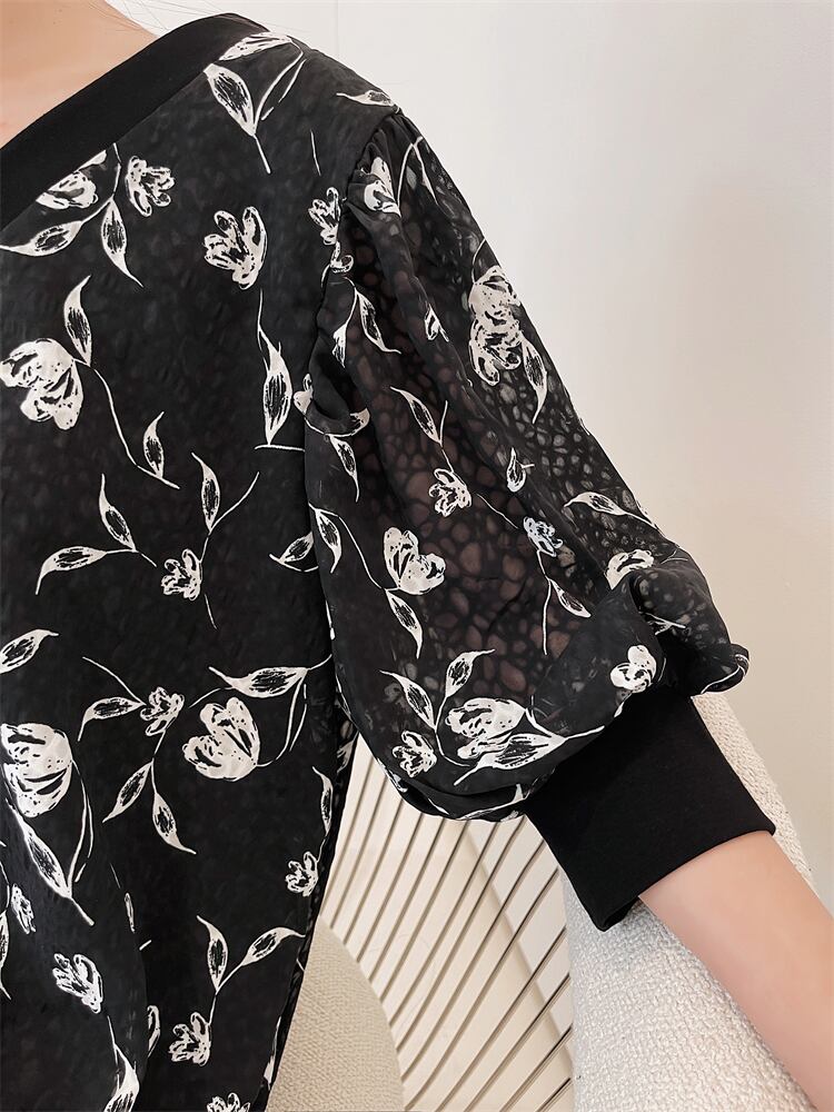 7分袖の袖付きで、きれいめなVネックデザインと切り替えデザインが特徴のワンピースです。 上品で清楚な印象を与えるシースルー素材を使い、上品さと可愛らしさが同居したデザインです。