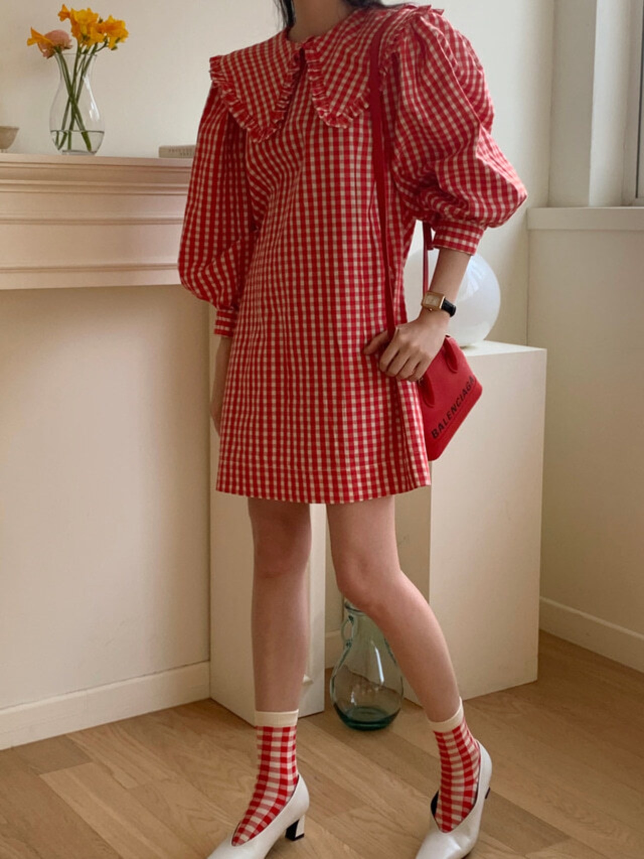 ワンピース ミニワンピース ミニ丈 袖付き 長袖 ビックカラー かわいい 大人可愛い きれいめ シンプル カジュアル 大人 上品 おしゃれ かっこいい レトロ 大人女子 こなれ感 ラフ ラブリー キュート ガーリー 個性的 主役級 存在感 春 秋 チェック柄 10代 20代 レディース 女性用 デート お出かけ 女子会 お泊まり 休日 パーティー イベント リゾート レストラン ショッピング 着回し 普段使い 重ね着 韓国系 モテ ワンサイズ 美脚 脚長 ファッション コーデ スタイル スレンダー
