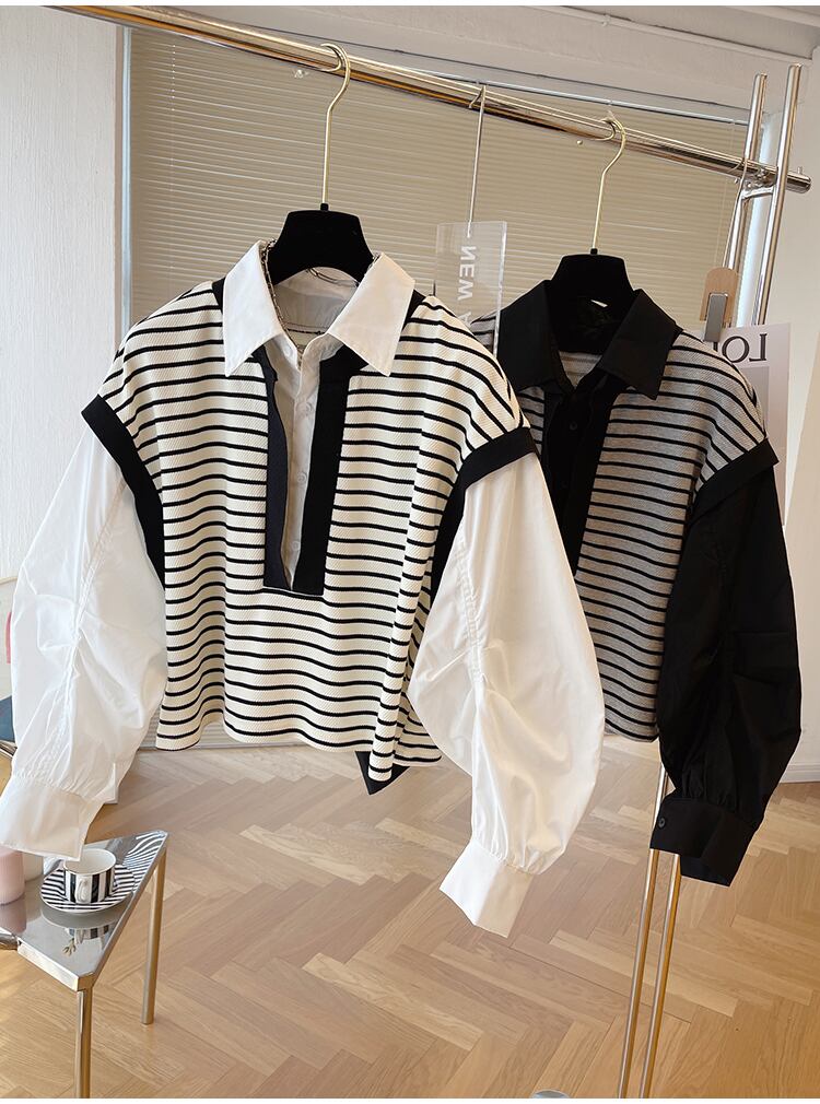 トップス 重ね着風 プルオーバー ショート丈 袖付き 長袖 ボリューム袖 襟付き 角襟 かわいい 大人可愛い きれいめ シンプル カジュアル 大人 上品 おしゃれ かっこいい 大人女子 こなれ感 レトロ キュート ガーリー 個性的 主役級 存在感 無地 ボーダー柄 春 秋 10代 20代 30代 レディース 女性用 ママ 学生 通学 デート お出かけ 女子会 お泊まり 休日 旅行 ホテル ショッピング レストラン 着回し 普段使い 重ね着 ファッション スタイル スレンダー モテ コーデ M L
