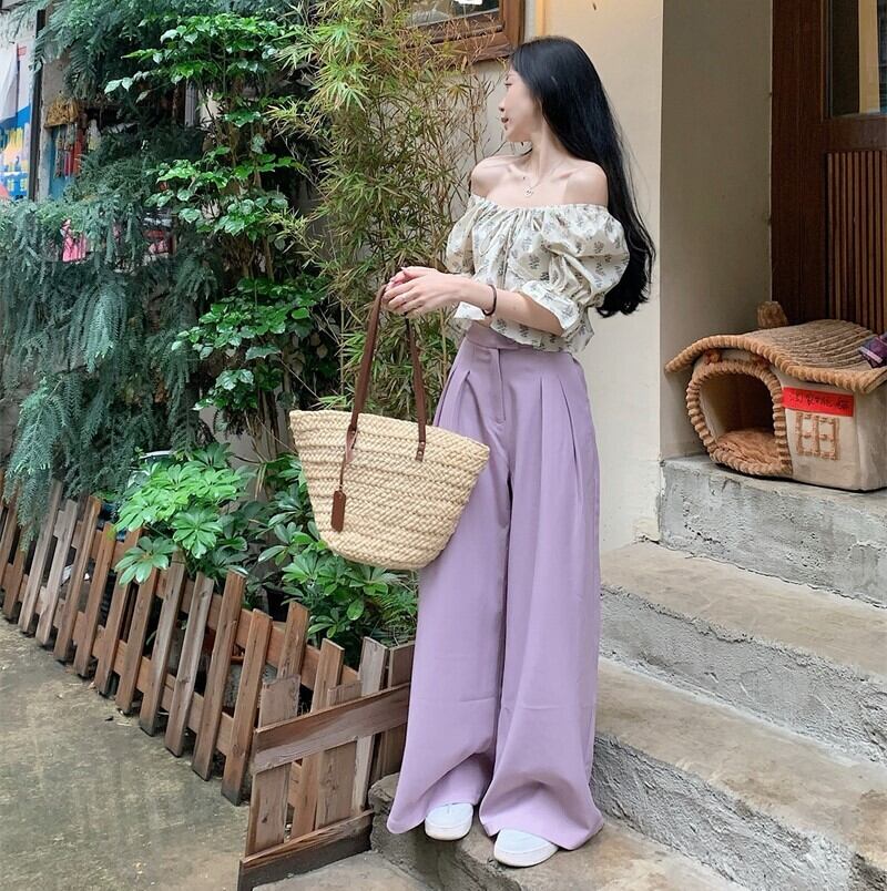 色展開 花柄ブラウス パープルパンツ