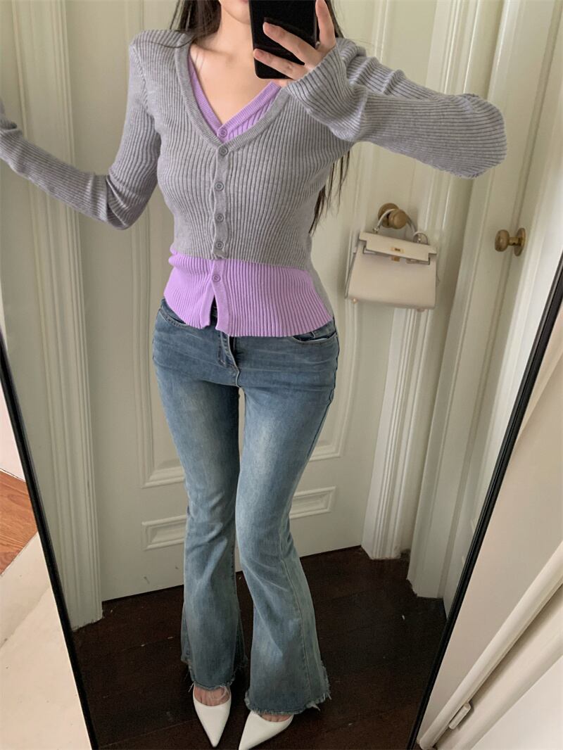 重ね着風なので一枚持っているだけでおしゃれになれるカーディガンです。Vネックが女性らしさを引き立てつつ、肩から袖にかけてのラインが細見え効果を発揮します。ショート丈なのでスカートやハイウエストパンツとの相性が抜群。