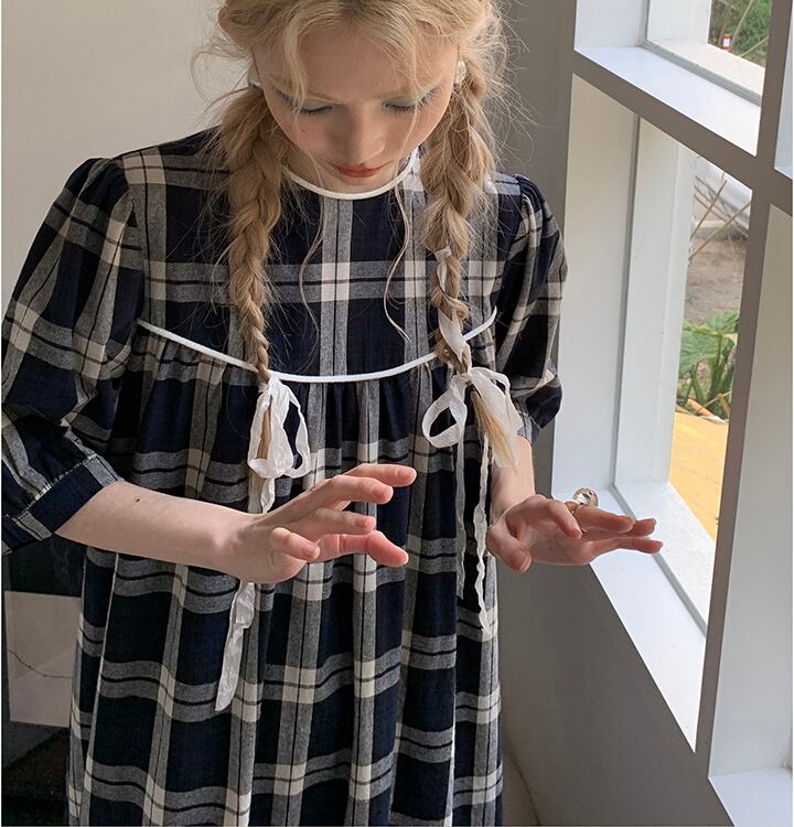 ワンピース ドールドレス プルオーバー ロングスカート シャツワンピース ロング ロング丈 袖あり 五分袖 ラウンドネック 襟なし ストレート ワイド ボタンあり かわいい 大人可愛い おしゃれ お洒落 レトロ 大人可愛い ラフ チェック柄 春 秋 10代 20代 30代 レディース 女性用 ママ マタニティ 女の子 学生 デート お出かけ 女子会 休日 イベント リゾート 旅行 高原 ガーデン 普段使い ファッション コーデ 楽ちん 体系カバー サイズ S 大きい 大きめ ゆったり ゆる ネイビー