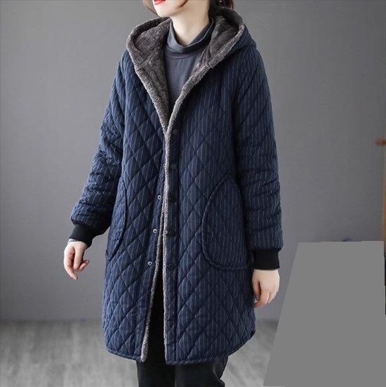 コート アウター ショートコート ウィンドジャケット ベルベット ストライプ柄 厚手 ミッドレングス 綿パッド入り ルーズ フード付き ミディアム丈 長袖 前開き ボタン 上品 おしゃれ 個性的 レトロ ポケット エレガント シック トレンディ カジュアル お出かけ アウトドア 休日 リゾート 旅行 スタイル 主役級 存在感 高級感 ゆったり 冬 ルーズ 体型カバー モテ 新作 インスタ映え サイズ L XL 2XL 3XL 色展開 ネイビー(ストライプ柄) ブラック(ストライプ柄) 大人カラー