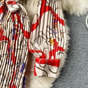 エレガントな膝下ロング丈のフレアワンピースです。プリントが贅沢に使われたデザインで、大人の女性にふさわしい上品な印象を与えます。ウエストリボンが付いているので、フィット感も調整可能です。