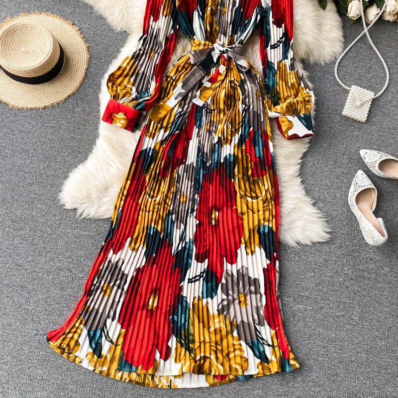 ワンピース フレアワンピース ロングドレス 膝下 ロング ロング丈 袖あり 長袖 襟付き スタンドカラー プリーツ リボン ウエストリボン 薄手 きれいめ 大人 上品 おしゃれ お洒落 レトロ 大人女子 エレガント 柄 花柄 プリント 春 秋 20代 30代 40代 レディース 女性用 デート お出かけ 休日 イベント リゾート 旅行 高原 ホテル ガーデン レストラン 普段使い ファッション コーデ スタイル プレゼント ギフト フリーサイズ 色展開 黒 ブラック 赤 レッド 緑 グリーン 黄色 カーキ