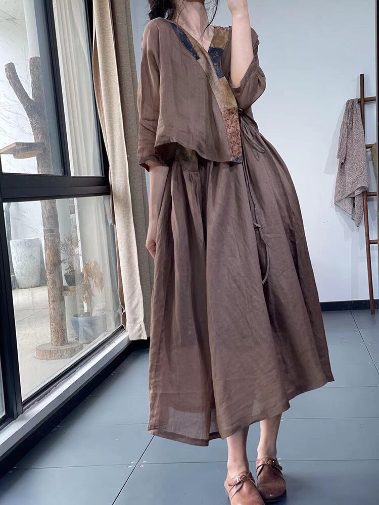 ワンピース ロング丈 袖あり 七分袖 Vネック 襟なし ルーズ ポケット プルオーバー 綿 リネン 薄手 コットン 大人可愛い きれいめ シンプル カジュアル 大人 上品 お洒落 かっこいい レトロ 大人女子 こなれ感 ラフ ラブリー キュート 存在感 とろみ感 抜け感 無地 春 夏 10代 20代 30代 40代 レディース デート お出かけ 女子会 休日 リゾート 旅行 ショッピング 普段使い 韓国系 オルチャン ファッション 楽ちん モテ トレンド 流行 M L XL 2XL ブラウン ネイビー