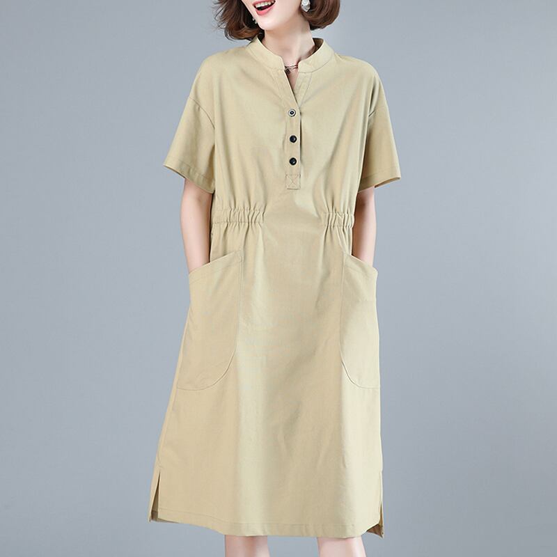 ワンピース シャツワンピース ミモレ丈 袖あり 半袖 スタンドカラー ルーズ ポケット ハイウエスト ウエストゴム 伸縮性 プルオーバー 綿 リネン 薄手 コットン 大人可愛い きれいめ シンプル カジュアル 大人 上品 お洒落 かっこいい レトロ 大人女子 こなれ感 ラフ 存在感 とろみ感 抜け感 無地 夏 20代 30代 40代 レディース デート お出かけ 女子会 お泊まり 休日 ショッピング 普段使い 韓国系 オルチャン スタイル 楽ちん トレンド 流行 M L XL 2XL カーキ ネイビー
