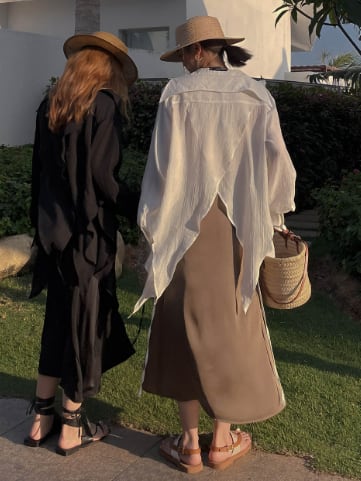 新鮮なアジアンテイストが魅力の個性的なアウターシャツが登場しました。襟付きの長袖デザインで、肩から流れるアシンメトリーなカッティングとバックシャンが特徴的。前後差があるバックコンシャスなデザインで、バーベキューやアウトドア、リゾート地でのおしゃれな着こなしにぴったりです。透け感のある薄手素材が夏らしさをアップし、大人可愛さやこなれ感を演出します。無地のホワイトとブラックのモノトーンカラーは、コーディネートしやすく幅広い年代に愛されています。S.M.Lのサイズ展開で、ゆったりとした着心地が魅力の一つ。ビーチやプール、お揃いで双子コーデもおすすめです。カジュアルからちょっとフェスティバルな雰囲気を演出する、思いきったファッションに挑戦したい方に是非おすすめしたい一着です。