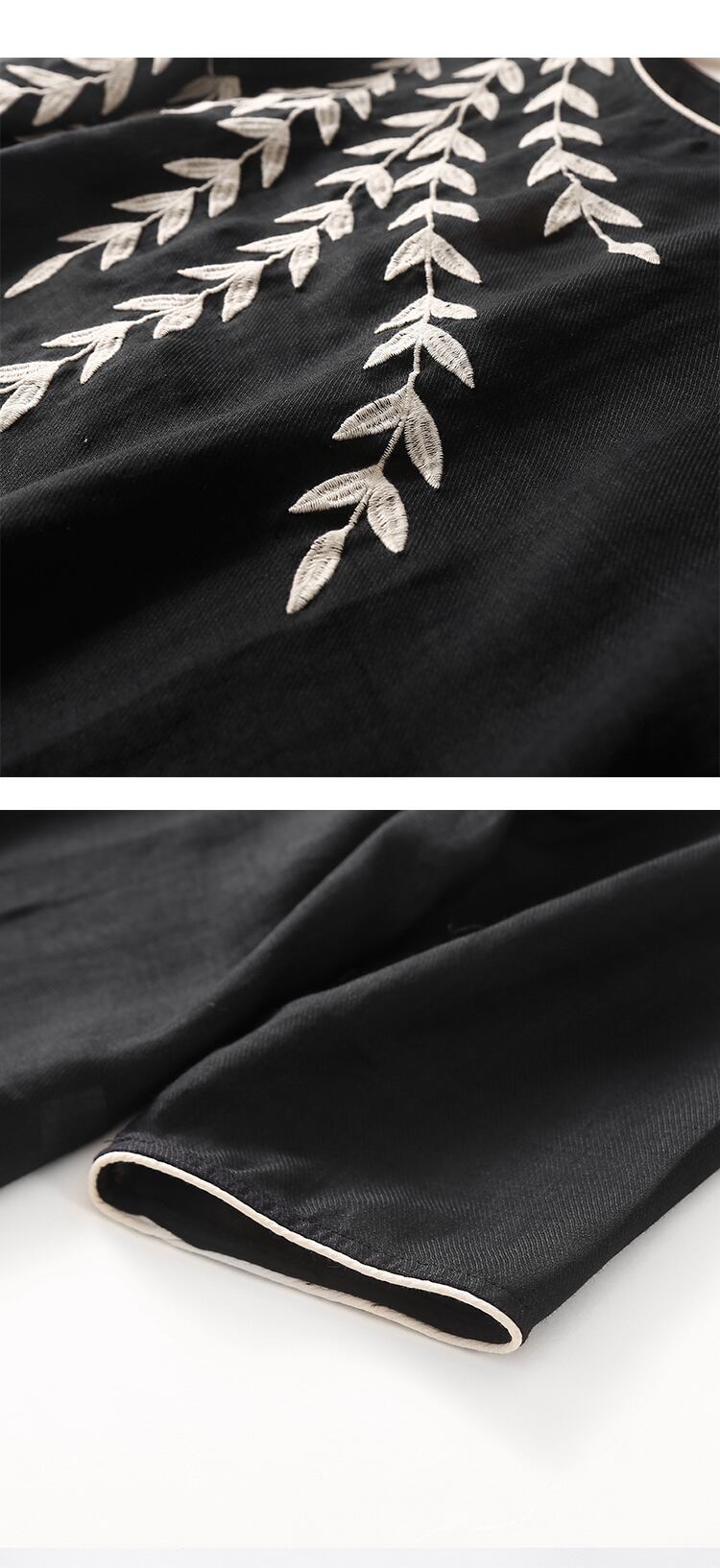 ワンピース ひざ下 刺繍 ゆったり 上品 大人 7分袖 七分袖 Uネック ラウンドネック 襟なし ワイド 綿 リネン 薄手 コットン かわいい 可愛い シンプル おしゃれ お洒落 レトロ アジアン 大人可愛い 大人女子 こなれ感 ラフ 個性的 エレガント 主役級 リーフ柄 ボタニカル 春 夏 秋 10代 20代 30代 40代 レディース 女性用 ママ マタニティ 休日 旅行 ショッピング 普段使い 楽ちん 体系カバー トレンド 流行 M L XL 2XL 黒 ブラック 灰色 グレー サイドスリット