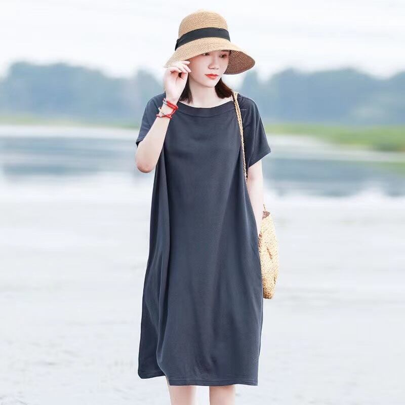 ワンピース コットン ゆる ゆったり 楽ちん ルームウェア シンプル カジュアル かわいい 部屋着 寝巻き ナイトウェア 膝下 袖あり 半袖 Uネック 襟なし セミフレア 伸縮性 綿 薄手 可愛い きれいめ おしゃれ 大人可愛い 大人女子 こなれ感 ラフ ルーズ とろみ感 抜け感 無地 春 夏 10代 20代 30代 レディース 女性用 ママ マタニティ 学生 通学 休日 旅行 着回し 普段使い 体系カバー M L XL 2XL 3XL 黒 ブラック 赤 レッド 灰色 グレー ポケット ルーズ 大人カラー