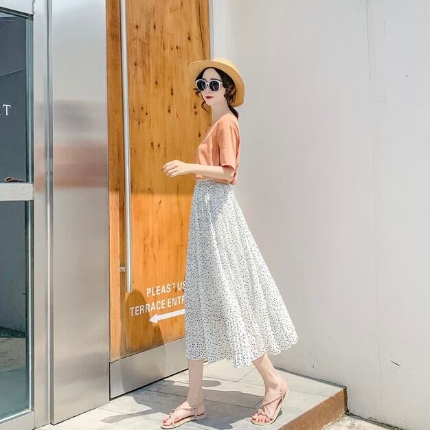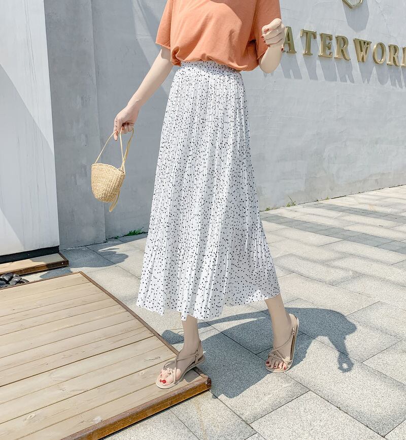 スカート ボトムス プリーツスカート ミドル丈 ルーズ プリーツ シフォン ふわふわ ハイウエスト 薄手 大人可愛い きれいめ シンプル カジュアル 大人 上品 お洒落 かっこいい レトロ 大人女子 こなれ感 ラフ ラブリー キュート 存在感 とろみ感 抜け感 ドット柄 夏 10代 20代 30代 レディース デート お出かけ 女子会 お泊まり 休日 旅行 ショッピング 普段使い 重ね着 韓国系 オルチャン コーデ スタイル モテ 美脚 脚長 トレンド 流行 ワンサイズ ホワイト ブラック アプリコット