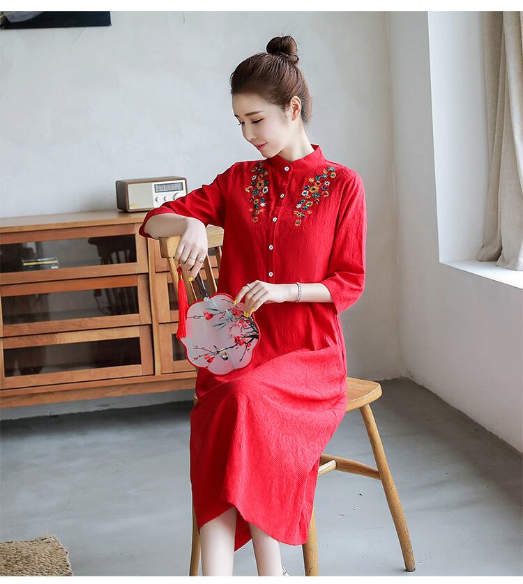 ワンピース 刺繍 花柄 スタンドカラー シャツワンピ カラバリ 膝下 袖あり 7分袖 七分袖 Aライン ポケット 綿 リネン 薄手 コットン かわいい 可愛い きれいめ シンプル カジュアル おしゃれ お洒落 かっこいい レトロ アジアン ラフ キュート 春 夏 10代 20代 30代 レディース 女性用 学生 通学 デート お出かけ 女子会 休日 ショッピング デート 普段使い 楽ちん 体系カバー L XL 2XL 3XL 大きいサイズ ゆったり 白 ホワイト 赤 レッド 紫 パープル 黄色 イエロー