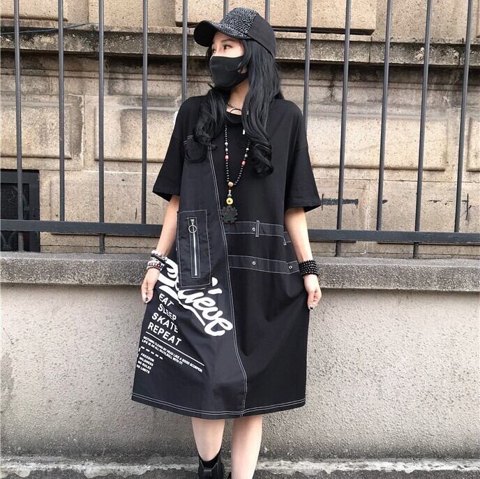 ワンピース 個性的 ロック モード かっこいい ひざ下 Tシャツワンピ ビッグT 袖あり 半袖 Uネック 襟なし 綿 薄手 コットン カジュアル おしゃれ お洒落 ラフ メンズライク ボーイッシュ スポーティー クール 主役級 存在感 プリント 春 夏 秋 10代 20代 レディース 女性用 学生 お出かけ 休日 イベント 普段使い 楽ちん 体系カバー トレンド 流行 インスタ映え ビッグサイズ ゆったり オーバーサイズ ワンサイズ 黒 ブラック マタニティ ルームウェア 部屋着 パッチワーク ベルト