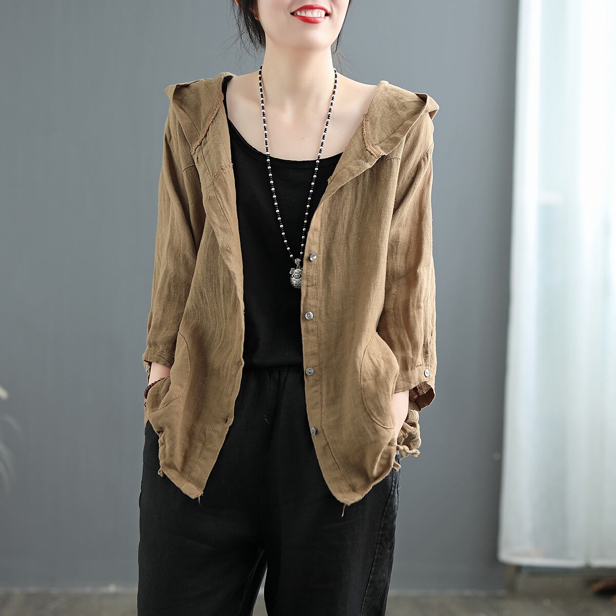 前開きになっているので、脱ぎ着も楽ちんです。着心地も良く、生地は程よく薄手で軽やか。