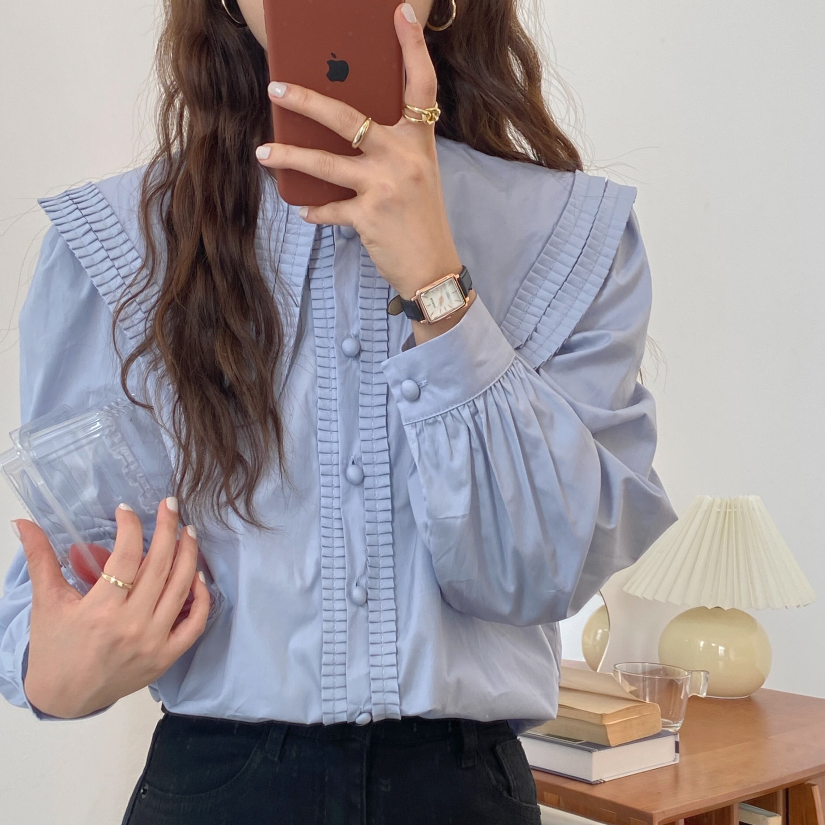 シンプルかつ上品なデザインが特徴の長袖シャツ。襟付きラペルと細プリーツが大人可愛いアクセントになっています。ストレートなシルエットで、かわいいだけでなくきれいめな着こなしにもぴったり。また、丸ボタンもかわいらしさをアップしてくれます。無地なので、デートやお出かけなど様々なシーンで活躍します。