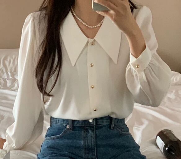 大きめの襟とゴールドの丸いボタンが大人可愛い長袖シャツ。シンプルだからこそパールネックレスやお好みのアクセサリーがよく映えます。デニムを合わせてカジュアルに決めてもかっこいいですし、Aラインスカートを合わせて可愛さをプラスしてもおしゃれです。