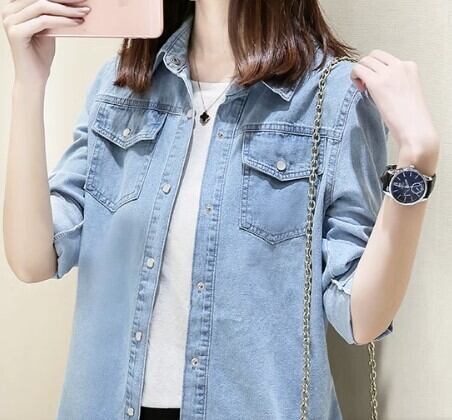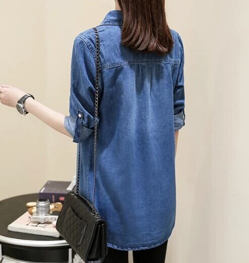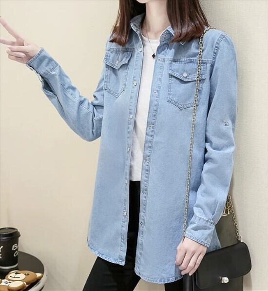 大人可愛いきれいめなデニムシャツです。ポロカラーで、ミドル丈で、前開きのデザインが女性らしさを引き立てます。丈夫で、長く着用できる薄手の素材を使用し、春夏にぴったりです。