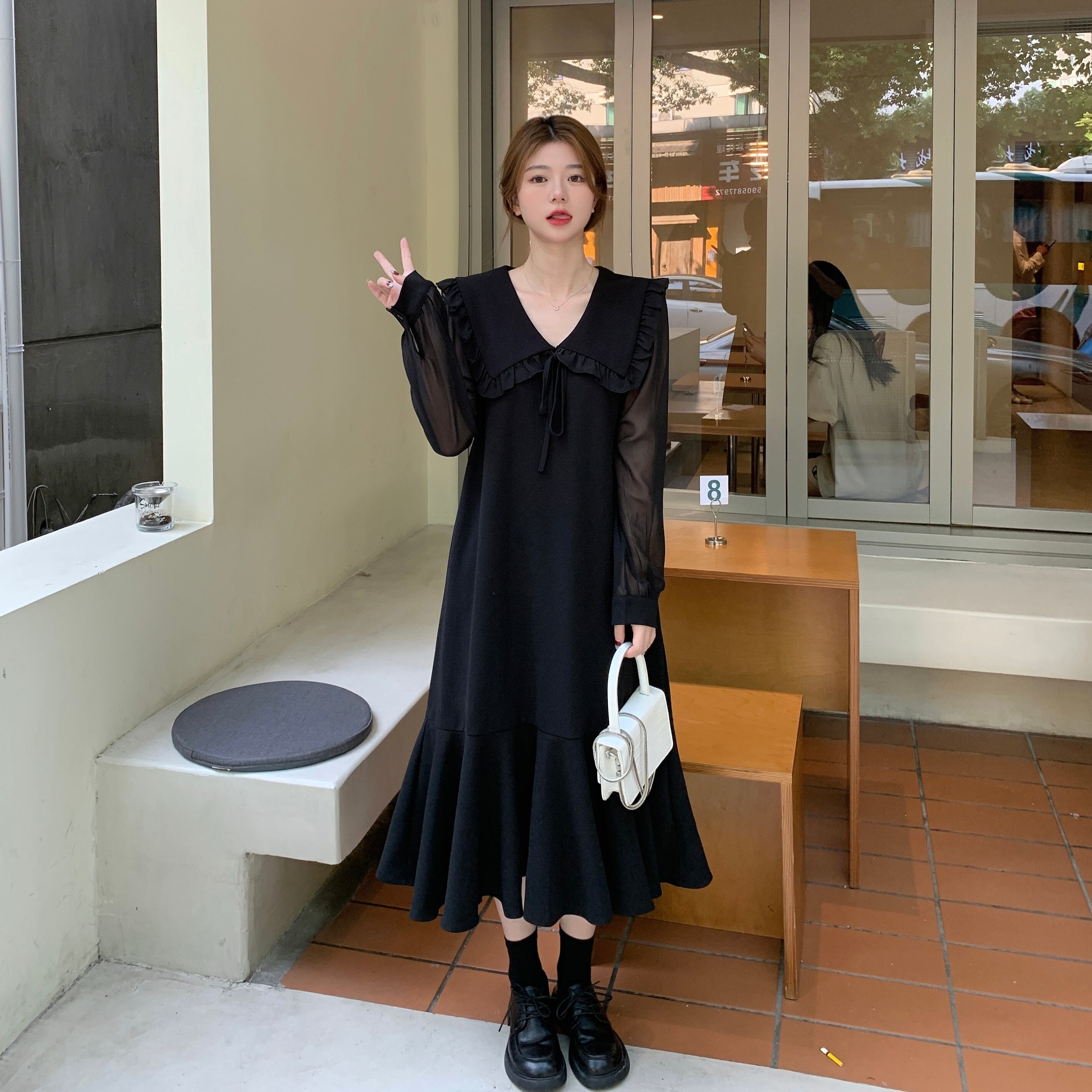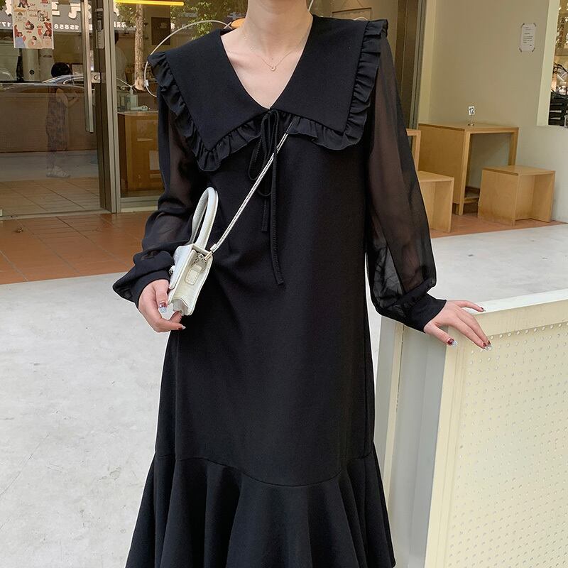 ワンピース ロングスカート ロング丈 袖あり 長袖 パフスリーブ Vネック 襟なし ルーズ Aライン フリル ふわふわ 透け感 シースルー プルオーバー 大人可愛い きれいめ シンプル カジュアル 大人 上品 お洒落 かっこいい レトロ 大人女子 こなれ感 ラフ ラブリー キュート 主役級 存在感 とろみ感 抜け感 無地 秋 冬 10代 20代 30代 レディース デート お出かけ 女子会 お泊まり 休日 普段使い 韓国系 オルチャン 楽ちん トレンド 流行 M L XL 2XL 3XL 4XL ブラック