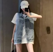 ベスト アウター デニムベスト レディース カジュアルベスト 袖なし ポロ襟 ツーピース 2点セット Tシャツ 半袖Tシャツ 無地 切り替えデザイン 春 夏 レギュラー丈 チョッキ 前開き シングルブレスト ノースリーブ かわいい きれいめ ワイルド 大人可愛い おしゃれ 学生 通学 個性的 ルーズ レトロ ポケット ボタン カジュアル キュートトレンディ デート お出かけ 休日 旅行 アウトドア シンプル キャンプ グランピング 釣り 海 山 主役級 新作 インスタ映え サイズ S 色展開 ライトブルー