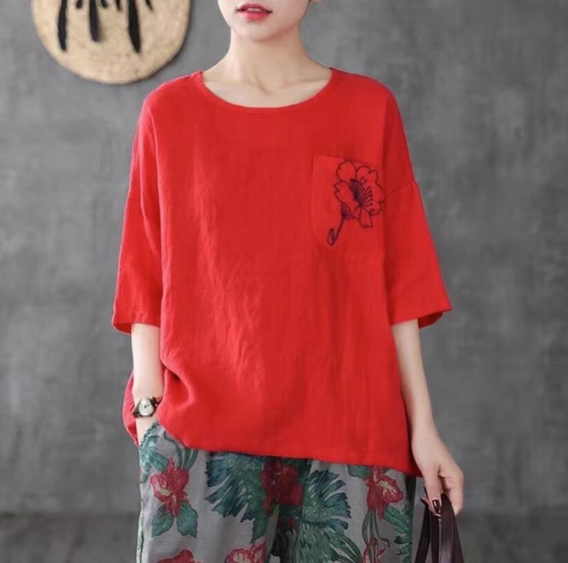 トップス Tシャツ ミドル丈 半袖 Uネック ワイド 刺繍 ポケット かわいい 大人可愛い きれいめ シンプル カジュアル おしゃれ お洒落 ラフ 無地 夏 10代 20代 30代 レディース デート お出かけ ファッション コーデ サイズ M L XL 2XL 3XL 4XL ゆったり ゆる 色展開 ホワイト レッド イエロー グリーングレー サマー ワンポイント ポケット ナチュラル
