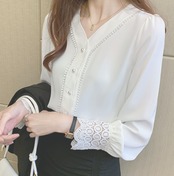袖口の刺繍とVネックを囲むようにデザインされた模様がおしゃれで可愛らしい長袖トップス。ビジネスシーンではもちろん、お出かけやデートの時にも大活躍すること間違いなしです。トップスをコーディネートの主役にするのならシンプル無地のボトムスを合わせるのがおすすめです。