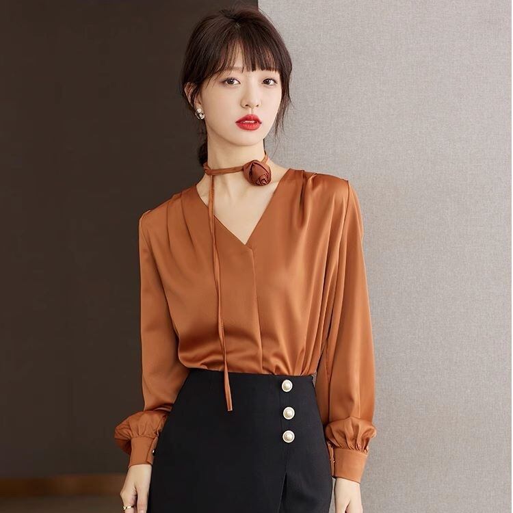 トップス シャツ ブラウス ミディ丈 チョーカー 花モチーフ 袖あり 長袖 ボリューム袖 Vネック タック 前開き 薄手 大人可愛い きれいめ シンプル スタイリッシュ カジュアル 大人 上品 お洒落 大人女子 こなれ感 個性的 セクシー エレガント 主役級 フォーマル 抜け感 無地 春 秋 冬 食事会 20代 30代 40代 ママ 通勤 学生 通学 デート お出かけ 女子会 休日 旅行 着回し 普段使い 重ね着 オルチャン 定番 トレンド 流行 インスタ映え S M L XL オレンジ