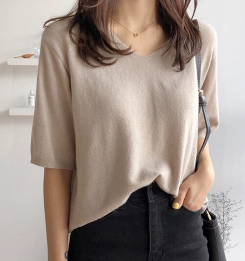 トップス ニットソー 袖あり 半袖 5分袖 五分袖 Vネック スマート サマーニット 大人可愛い きれいめ シンプル カジュアル 大人 上品 おしゃれ お洒落 大人女子 こなれ感 エレガント 無地 夏 20代 30代 40代 50代 60代 レディース 女性用 ママ ビジネス OL 通勤 デート お出かけ 女子会 休日 イベント 旅行 着回し 普段使い ファッション コーデ スタイル 楽ちん 体系カバー 定番 L XL 2XL ゆったり 黒 ブラック ピンク 大人カラー アプリコット