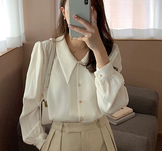 トップス シャツ シフォンシャツ ブラウス 袖付き 長袖 襟付き 角襟 前開き かわいい 大人可愛い きれいめ シンプル 大人 上品 おしゃれ かっこいい レトロ 大人女子 こなれ感 クール フォーマル モダン 個性的 主役級 存在感 無地 春 夏 秋 冬オールシーズン 10代 20代 30代 レディース ママ OL 通勤 オフィス ビジネス デート お出かけ 女子会 お泊まり 休日 リゾート 旅行 ホテル ショッピング レストラン 着回し 普段使い 重ね着 S M L XL ファッション コーデ