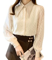 少し大きめの襟とパフスリーブがキュートな長袖シャツ。シフォン素材の柔らかな生地とリーフにも見える模様が上品です。同系色のさりげないバイカラーもおしゃれポイントブラウン系やパープル、ブルー系のスカートを合わせると大人可愛く纏まります。