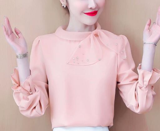 清楚系 トップス シャツ 袖あり 長袖 ボリューム袖 ランタンスリーブ ラウンドネック シフォン リボン スパンコール パールボタン かわいい 大人可愛い きれいめ 大人 上品 おしゃれ お洒落 大人女子 こなれ感 ラブリー キュート ガーリー 無地 春 秋 20代 30代 レディース 女性用 ママ OL 通勤 デート お出かけ 女子会 休日 イベント 旅行 着回し 普段使い 韓国 韓国系 ファッション コーデ スタイル モテ M L XL 白 ホワイト ピンク 水色 ライトブルー