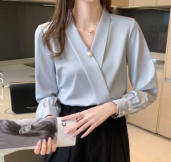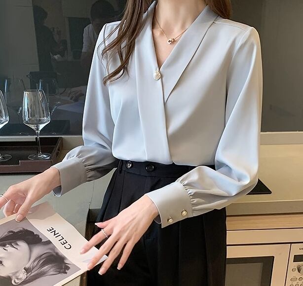 Vカットのデザインから覗くデコルテがセクシーで、女性らしい印象を与えるブラウス。