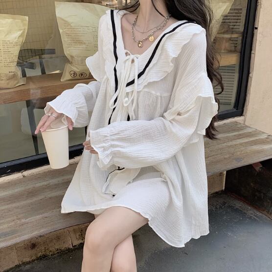 シャツワンピース トップス ワンピース デート ブラウス ショート丈 袖あり 長袖 Vネック シフォン フリル 透け感 シースルー かわいい シンプル カジュアル おしゃれ お洒落 こなれ感 ラフ ラブリー キュート ガーリー ルーズ とろみ感 抜け感 無地 春 夏 10代 20代 通勤 学生 通学 デート お出かけ 旅行 ショッピング 普段使い 韓国 韓国系 オルチャン ファッション コーデ スタイル 楽ちん 体系カバー トレンド 流行 インスタ映え サイズ S M L XL ゆったり 白 ホワイト