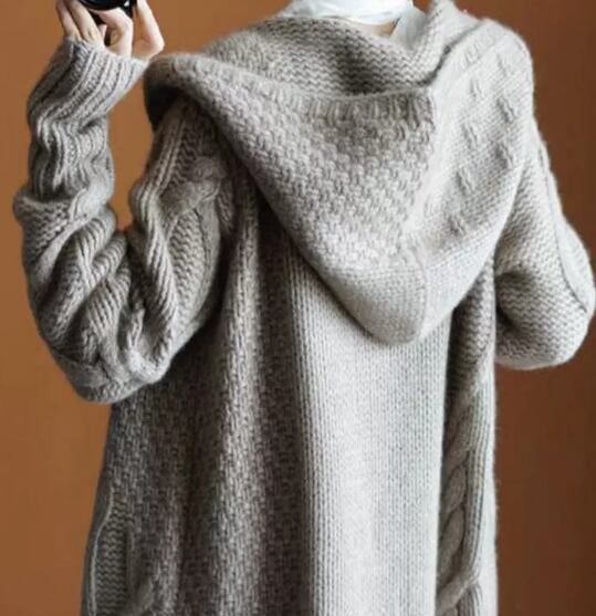 ざっくり編みが可愛いロング丈のニットカーディガン。しっかりとした厚みがあるので暖かく、寒い冬に重宝します。フード付きでバックシルエットも可愛いです。着た時のシルエットがきれいなので自然なIラインコーデが叶い、着痩せ効果も期待できます。ショート丈のボトムスを合わせてロングブーツを足元に持ってきたり、デニムをショートブーツにインしたりしてもおしゃれです。