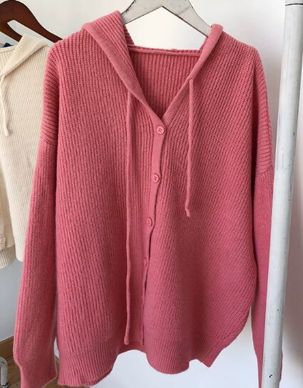 発色が綺麗なフード付きニットカーディガン。しっかりとした厚みがあるので防寒対策にぴったりのアイテムです。一枚でパーカーのように着ても可愛いですし、アウター代わりにお気に入りの一着の上に羽織ってもおしゃれ。シンプルなのでロゴ入りのトレーナーや柄物のボトムスとも相性抜群です。