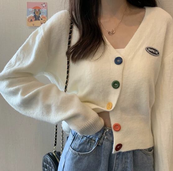 カラフルなボタンが印象的なニットカーディガン。ざっくりと開いたVネックもおしゃれです。少し丈が短めなのでハイウエストのボトムスと相性抜群。ハイネックのワンピースに重ね着しても可愛いです。