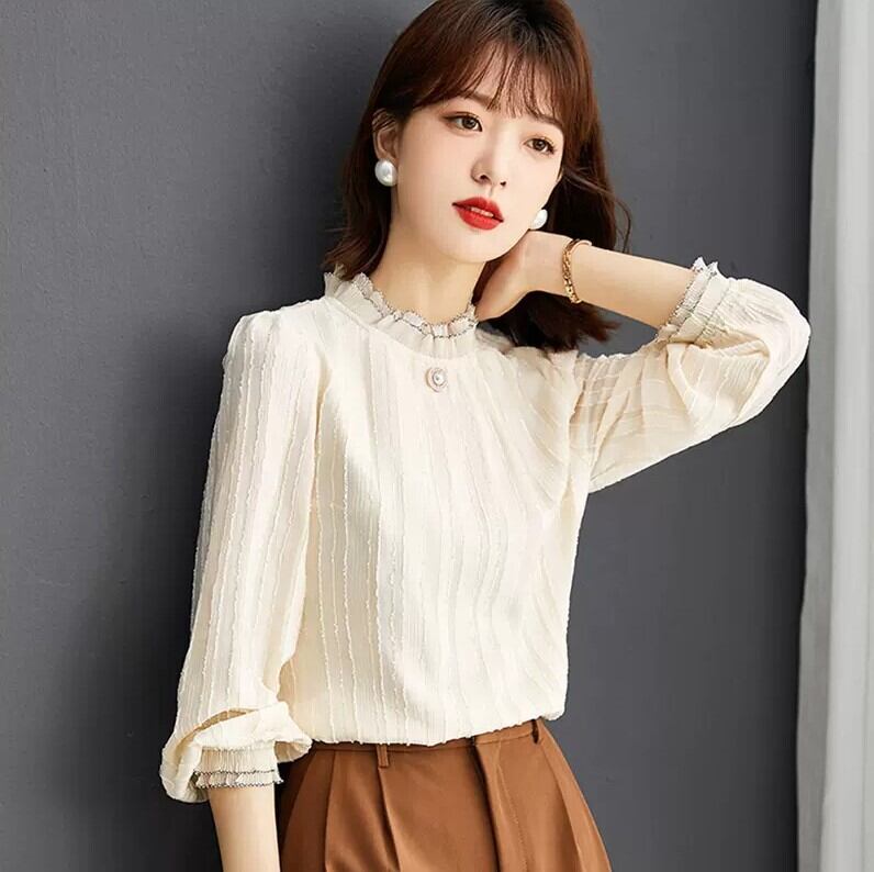 トップス ブラウス フリル フリルブラウス かわいい キュート スタンドカラー 袖あり 長袖 襟付き スリム タイト 細身 スマート 薄手 可愛い きれいめ 大人 上品 おしゃれ お洒落 レトロ 大人可愛い 大人女子 こなれ感 ラブリー ガーリー エレガント モダン 主役級 存在感 とろみ感 抜け感 無地 春 夏 秋 10代 20代 30代 レディース 女性用 オフィス ビジネス OL 通勤 学生 通学 デート お出かけ 休日 ホテル レストラン お呼ばれ モテ S M L XL 白 ホワイト ビジュー