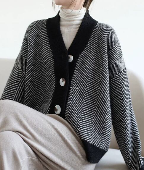 コート代わりに着られるしっかりとした厚みのあるニットカーディガン。ヘリンボーン模様がおしゃれで一枚で存在感抜群です。大きめのべっ甲ボタンも可愛いです。Vネックなので重ね着アイテムとして重宝します。シンプルで無地のハイネックのインナーとの相性◎