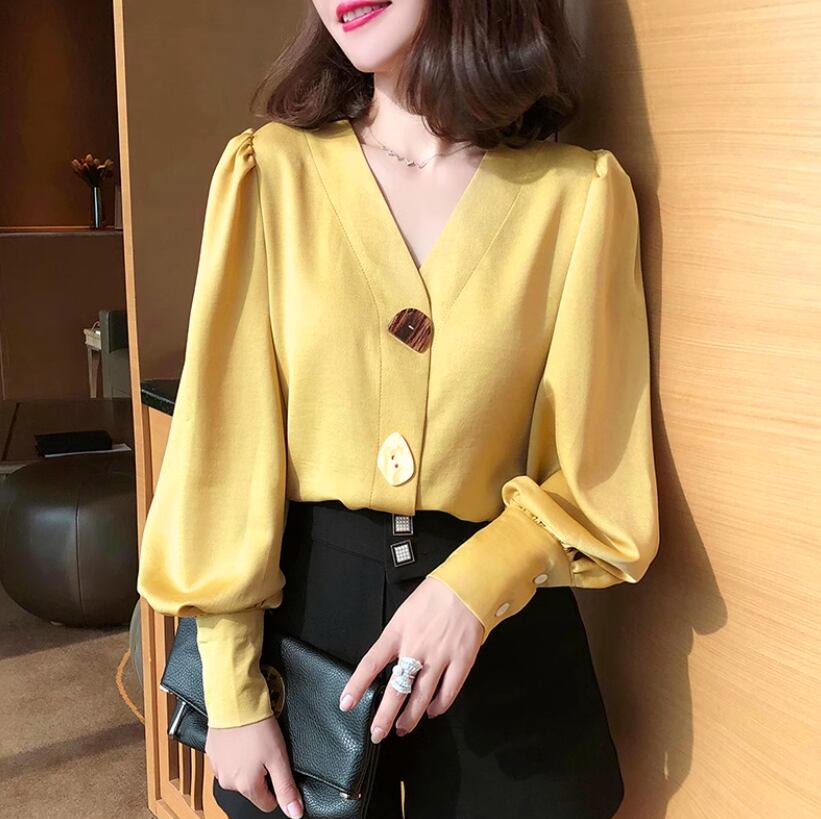 トップス シャツ 長袖 バルーンスリーブ Vネック ボタン かわいい 大人可愛い きれいめ シンプル カジュアル おしゃれ お洒落 個性的 無地 春 秋 10代 20代 30代 レディース デート お出かけ モテ ファッション コーデ スタイル サイズ S M L XL 2XL ゆったり ゆる 色展開 ホワイト イエロー ピンク