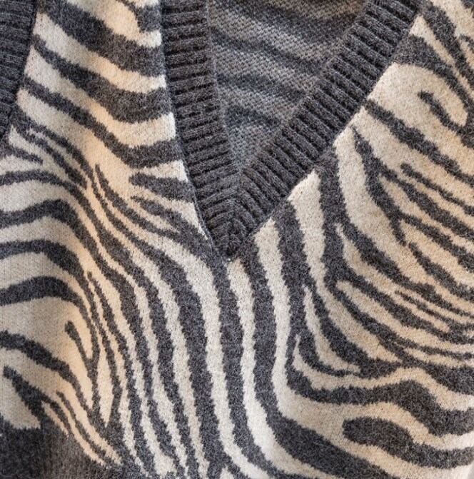 襟なしのVネックニット。こなれ感のあるゼブラ柄が印象的