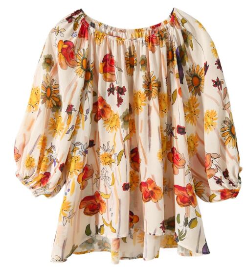 油絵調 トップス シャツ ブラウス プルオーバー 袖あり 7分袖 七分袖 ラウンドネック 襟なし シフォン 薄手 かわいい 大人可愛い きれいめ 上品 おしゃれ お洒落 レトロ 大人女子 ラフ キュート エレガント 主役級 存在感 とろみ感 華やか 花柄 春 夏 30代 40代 50代 60代 レディース 女性用 ママ デート お出かけ 公園 女子会 休日 イベント リゾート 旅行 海 着回し 普段使い 重ね着 楽ちん S M L XL 2XL ゆったり オフホワイト