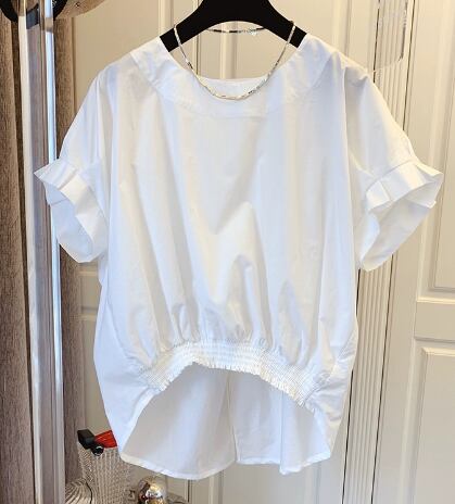 ゆったりとしたシルエットとバックリボンが可愛い半袖シャツ。二の腕をふんわりとカバーしてくれる袖のデザインも暑い夏には涼しくて嬉しいポイントです。前後で裾の長さが違うので、横からのシルエットもきれい。細身のパンツやマーメイドスカートを合わせても大人可愛いです。足元にはヒールかサンダルがおすすめ。