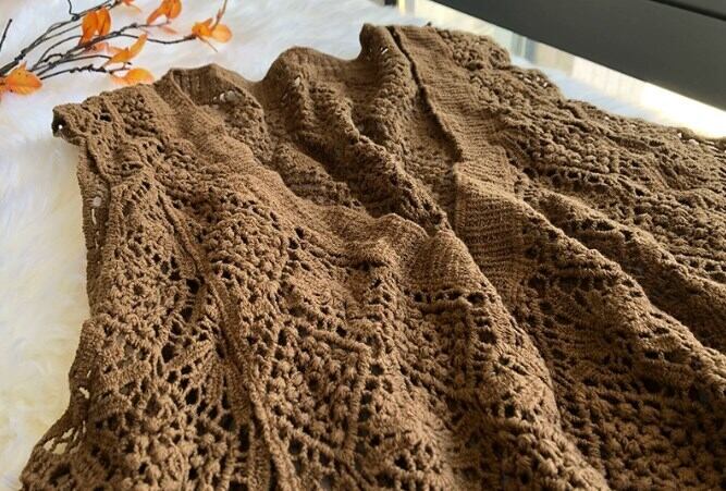 透かし編みが女性らしい印象を与え、Vネックによってデコルテも美しく見せてくれます。