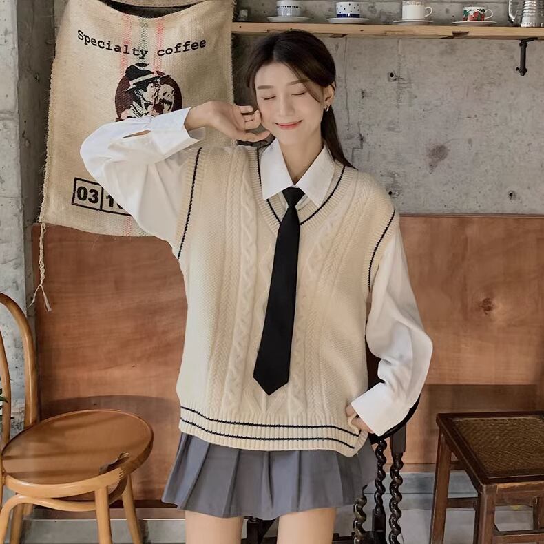 学生風 トップス シャツ ベスト 白シャツ ネクタイ付き 袖あり 長袖 Vネック 襟付き 前開き 編み込み ニット 3点セット お得 かわいい 大人可愛い カジュアル おしゃれ お洒落 大人可愛い ボーダー 春 秋 冬 10代 20代 レディース 女性用 通勤 学生 通学 デート お出かけ 女子会 休日 着回し 普段使い 重ね着 お揃い ファッション コーデ スタイル 楽ちん モテ プレゼント 体系カバー サイズ S M L 大きい 大きめ ゆったり ゆる 色展開 白 ホワイト 灰色 グレー アプリコット