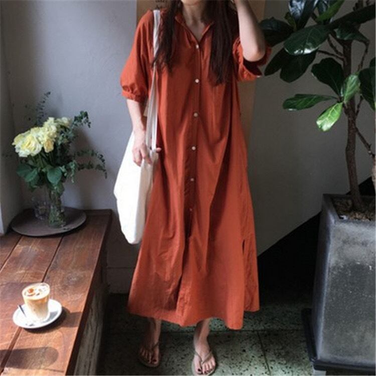 ワンピース シャツワンピース ミモレ丈 袖あり 五分袖 Vネック ルーズ Aライン ウエストマーク ハイウエスト 前開き 綿 コットン 大人可愛い きれいめ シンプル カジュアル 大人 上品 お洒落 かっこいい レトロ 大人女子 こなれ感 ラフ クール モード系 エレガント モダン 主役級 存在感 とろみ感 抜け感 無地 夏 20代 30代 40代 レディース デート お出かけ 女子会 お泊まり 旅行 ショッピング 普段使い 韓国系 オルチャン 楽ちん モテ トレンド 流行 ワンサイズ グリーン オレンジ