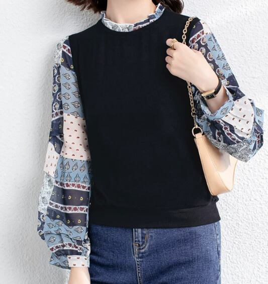 重ね着風のデザインがおしゃれな長袖トップス。ちらりと覗く襟部分と袖の柄が個性的で目を引きます。派手ではないですが存在感がある一枚なので、シンプルなボトムスと相性抜群。ジーンズはもちろん、デニムスカートを合わせても可愛いです。ネックレスを付けて胸元に華やかさを添えても◎