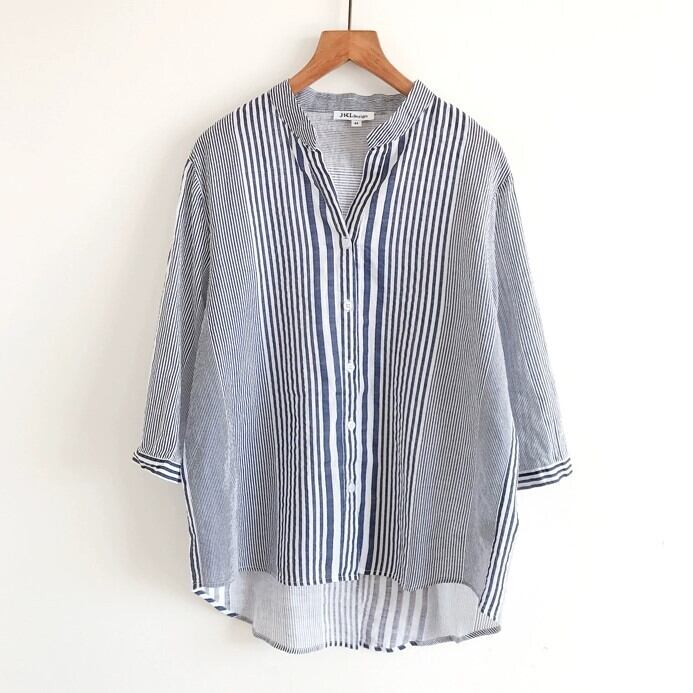 トップス シャツ ストライプ スタンドカラー 半袖 カットソー 袖あり 7分袖 ワイド 綿 コットン かわいい 可愛い シンプル カジュアル 大人 上品 おしゃれ お洒落 かっこいい レトロ 大人可愛い 大人女子 こなれ感 ラフ メンズライク ボーイッシュ クール 抜け感 シマ 春 夏 秋 10代 20代 30代 40代 50代 60代 レディース 女性用 オフィス ビジネス OL 通勤 学生 通学 休日 着回し 普段使い 体系カバー トレンド M L ゆったり ゆる ネイビー 自然体 楽ちん ボタン